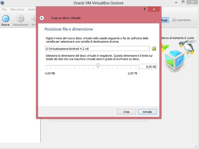 - Ora scegliete di creare un hard disk virtuale ora, quindi selezionate VDI e l’allocazione fissa, che occupa esattamente quanto vorrete sull’hard disk e verrà creata più lentamente rispetto all’allocazione dinamica ma vi garantirà prestazione nettamente superiori con Android 4.2.2. Lo spazio da assegnare va da un minimo di 1 GB ad un massimo di 32 GB.