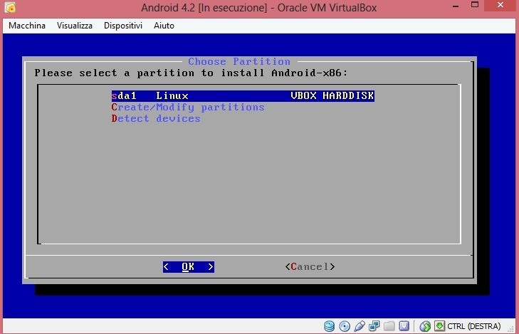 - Ora installate Android nella partizione sda1 selezionando poi come type ext3.