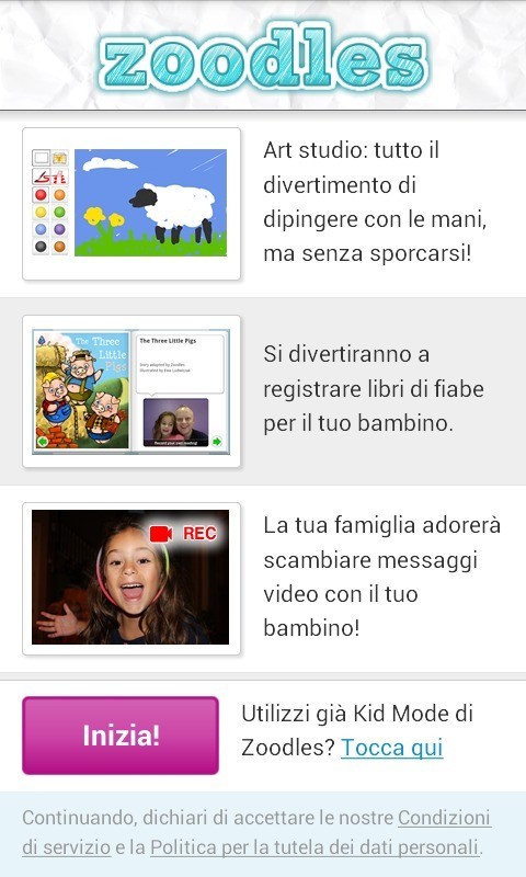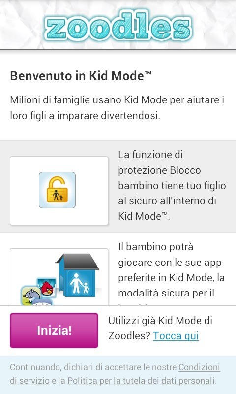 - Avviare ora l’applicazione Modalità Bambino dal proprio Smartphone o Tablet e selezionare il tasto Inizia!