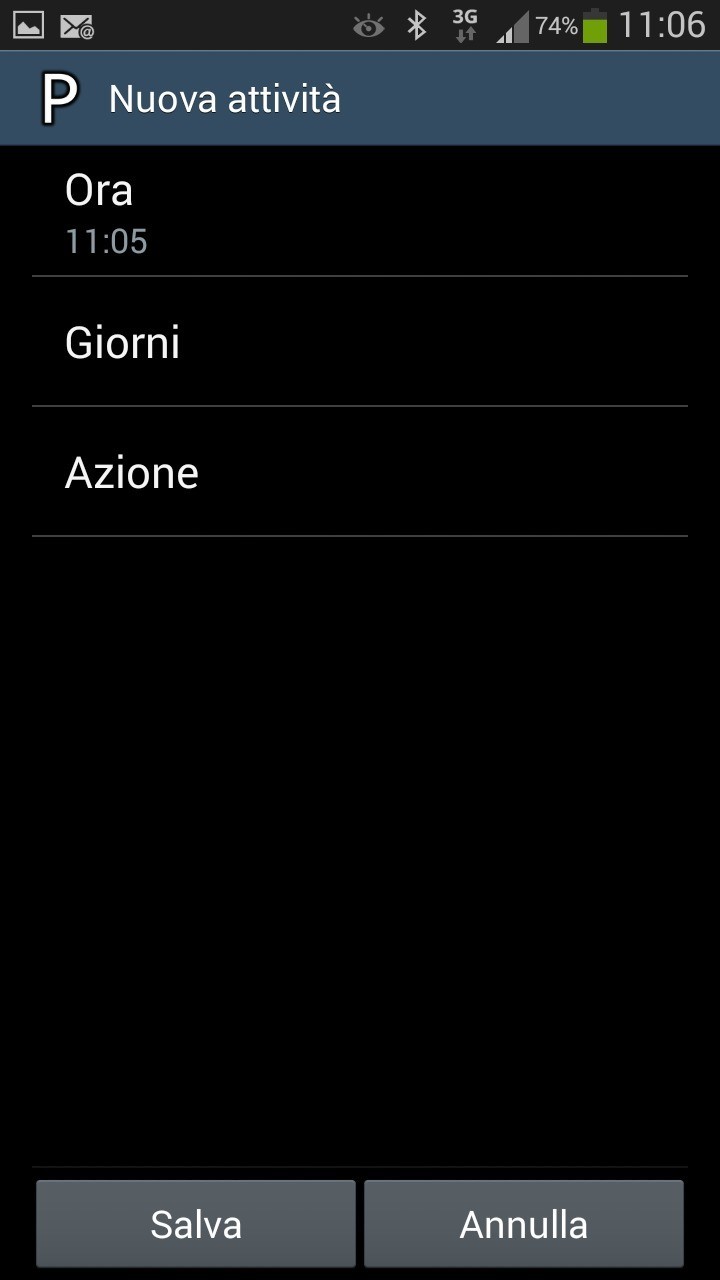 Selezionando “Aggiungi nuova attività”, verrà mostrata la seguente schermata che permetterà di programmare orario, giorni ed azione da eseguire.