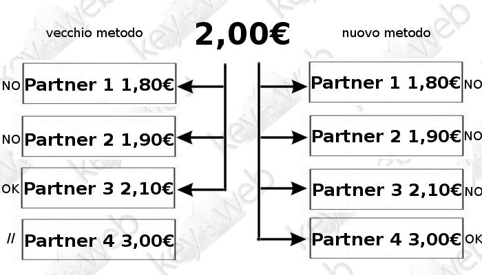 Quando gli utenti navigano all’interno di una pagina web si ritrovano certamente davanti ad una serie di spazi pubblicitari in cui vengono proiettate varie offerte. Le offerte cambiano di volta in volta ed il modo in cui un partner riesce ad aggiudicarsi quello spazio funziona seguendo una regola sequenziale. Cerchiamo di fare chiarezza e spiegare in che modo lo spazio disponibile viene assegnato. Ovviamente c’è bisogno che nel sito web in questione ci siano diversi partner ad exchange. Il più famoso è ovviamente Google, ma noi per semplicità li chiameremo partner 1, 2, 3 e 4.