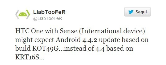 Android 4.4.2 KitKat è la prossima release e a dir la verità non è la prima volta che ne sentiamo parlare. Sono emerse nuove conferme sulla sua esistenza attraverso LlabTooFeR, che tramite Twitter ha comunicato che HTC Onesarà aggiornato direttamente ad Android 4.4.2 KitKat build KOT49G, saltando così Android 4.4 e 4.4.1.