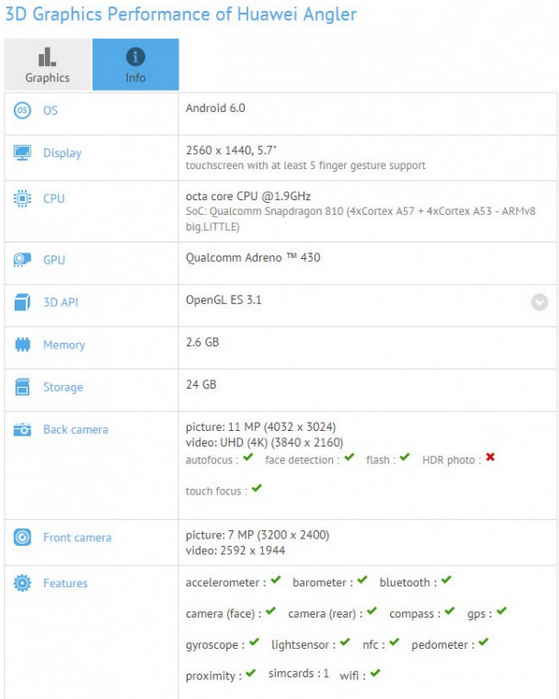 GFX Bench 3.1ha rilevato un display da 5.7 pollici di diagonale con risoluzione QHD (1.440 x 2,560px); il chipset è l’atteso Snapdragon 810 con 3 GB di RAM e 32 GB di spazio di archiviazione e monterà naturalmente l’attesissimo Android 6.0 Marshmallow.