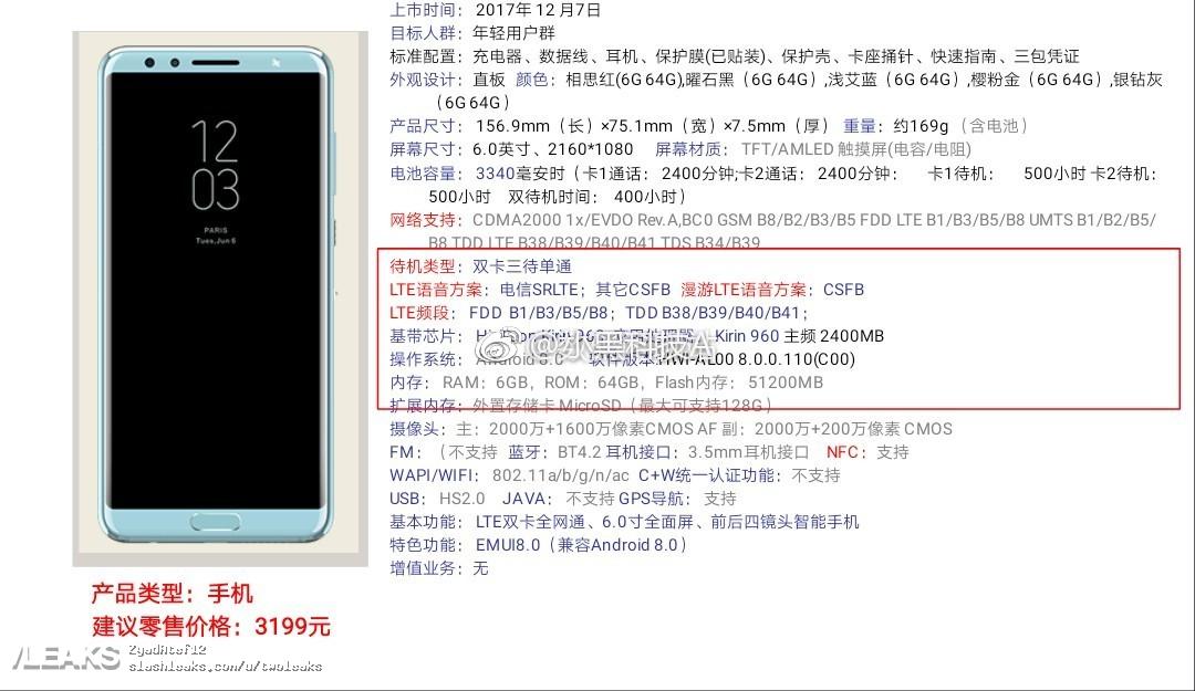 Due tagli di memoria RAM previsti, un 4GB con 64GB di memoria interna ed un 6GB con il medesimo quantitativo di storage. Il comparto fotografico prevede 4 camere. 2 camere posteriore da 20 megapixel + 16 megapixel, anteriormente una 20 megapixel + 2 megapixel. La batteria ha una capacità soddisfacente con i suoi 3340 mAh. Ovviamente a bordo è previsto ANdroid Oreo nelal versione 8.0.