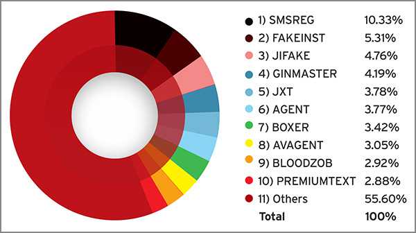Analizzando la tipologia delle minacce, il 69% dei malware che hanno colpito i dispositivi mobili è costituito da adware, una forma di malware che inonda l’utente di pop up pubblicitari, allo scopo di indurlo su siti maligni specifici o di registrare le sue abitudini di navigazione. A seguire, con il 24%, la seconda tipologia che ha colpito maggiormente i dispositivi è quella dei Premium Service Abuser, malware che fanno lievitare i costi degli utenti iscrivendoli a servizi senza il loro consenso. Al terzo posto le app specializzate nel furto dati, con il 10%.