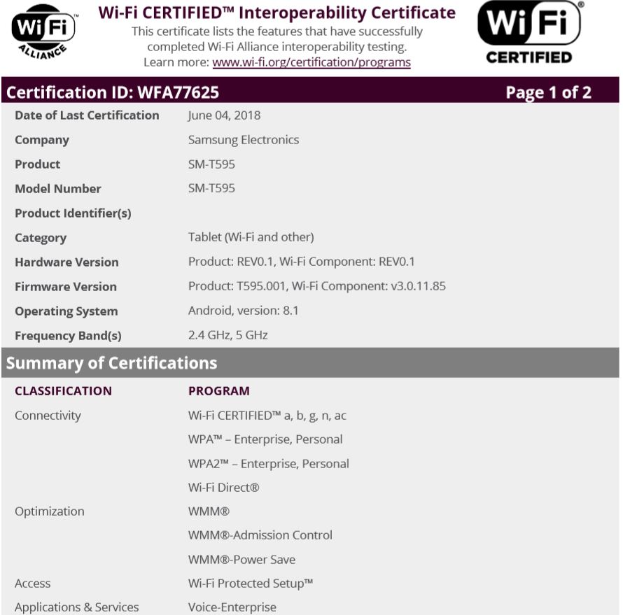 Il dispositivo ha recentemente ottenuto la certificazione WI-Fi, quindi a breve sarà inserito sul mercato. Il modello identificativo è il SM-T595 e probabilmente Samsung sceglierà di lanciarlo in sordina, un po’ come ha sempre fatto. A bordo con il tablet Android Oreo nella versione 8.1.