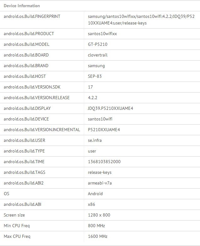 Il Galaxy Tab 3 10.1 sarà infatti dotato, e questa è la prima volta per un device Android Samsung, di un processore Intel Atom Z2560 dual-core da 1.6GHz con tecnologia Hyper-Threading, una Gpu PowerVR SGX 544 MP2 da 400MHz, display da 10.1 pollici con risoluzione 1280×800 il tutto gestito dal sistema operativo Android Jelly Bean 4.2.2.