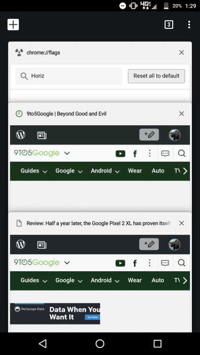L’ultima versione di Chrome ha iniziato a lavorare su uno strumento di spostamento tra schede orizzontale. Su Chrome 67 le schede si sovrapponevano, ma nella versione 68 esse sono state distanziate e il tool con il quale passare da una all’altra somiglia al menu “Recenti” di Android P. Cosa grandiosa per l’impatto visivo, e per il fatto che gli utenti possono ancora scorrere tranquillamente le schede tra loro.
