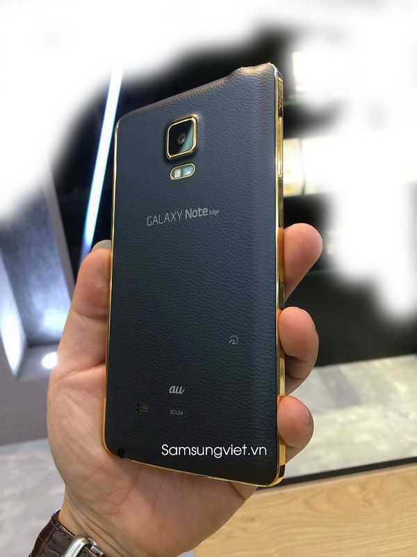 Una serie di tre immagini mostrano chiaramente una la doratura che il Galaxy Note Edge ha su quasi tutti i lati. L’oro è il materiale utilizzato per il telaio laterale leggermente sporgente del phablet, la griglia auricolare, il bilanciere del volume, nonché per l’anello della fotocamera e il sensore di frequenza cardiaca sul retro. Un altro omaggio per questa versione lussuosa del dispositivo Samsung è sottile scritta “au” posta sul coperchio posteriore rimovibile, che indica appunto il simbolo chimico dell’oro.