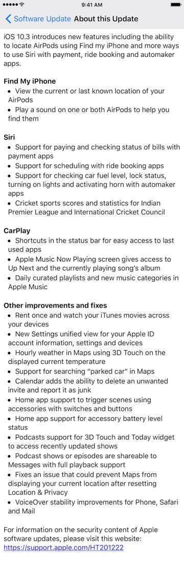 Dopo le recenti versioni beta testate a fondo dagli sviluppatori è tempo di una versione ufficiale per Apple con la nuova release di iOS 10.3 che ha reso ufficiale solo poche ore fa. Disponibile per i dispositivi iPhone, iPad ed iPod Touch compatibili ecco tutte le interessanti novità presenti nel changelog, oltre alle solite correzioni di bug e miglioramenti generali delle prestazioni: