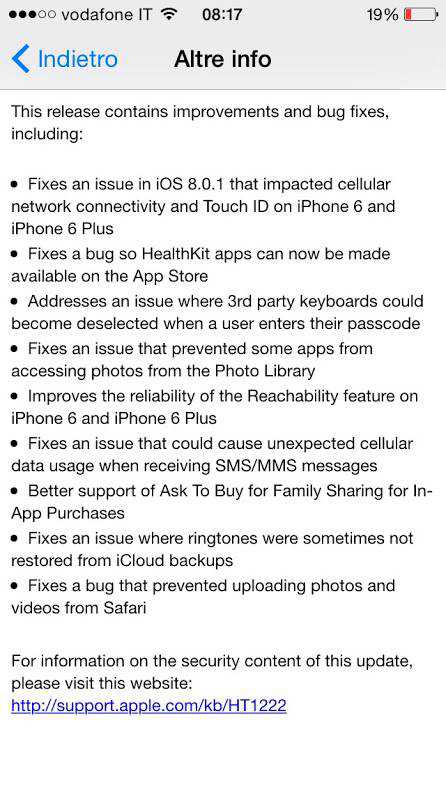 - Risolti i problemi di iOS 8.0.1 che causavano errori di connessione alla rete cellulare ed al Touch ID