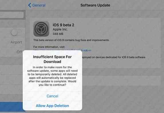 Per questo motivo Apple ha deciso di cambiare le carte in tavola e arriveranno con iOS 9. In fase di aggiornamento il sistema farà un’analisi dello spazio necessario e se non sarà sufficiente per il download dell’aggiornamento, cancellerà temporaneamente alcune applicazioni, che verranno reinstallate automaticamente in una fase successiva, senza che l’utente debba fare alcun che. Come potete vedere dall’immagine, la nuova funzionalità è stata rilasciata con la beta 2 di iOS 9 agli sviluppatori, cosa che dovrebbe essere riportata anche nella versione per utente finale.