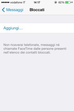 6. Blocco contatti. Da Impostazioni > Messaggi > Bloccati possiamo inserire il contatto o il numero della persona della quale non vorremo più ricevere telefonate, messaggi o chiamate FaceTime.
