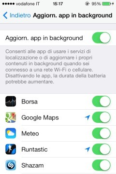 11. Aggiornare i contenuti delle app in background. Questa funzionalità consente alle App di usare i servizi di localizzazione o di aggiornare i propri contenuti in background quando si è connessi ad una rete Wi-Fi o cellulare. E’ possibile attivare/disattivare tale opzione in Impostazioni > Generali > Aggiornamento app in background.