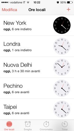 22. Orario analogico/digitale. All’interno dell’applicazione Orologio, sulla scheda Ore locali, con un semplice tap sopra il simbolo dell’orologio si può cambiare dalla grafica analogica a quella digitale.