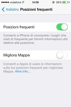 5. Posizioni Frequenti. L’opzione “Posizioni frequenti”, che si trova in Impostazioni > Privacy > Localizzazione > Posti Frequenti > Servizi di sistema, consente di memorizzare i luoghi più visitati dall’Applicazione Mappe.