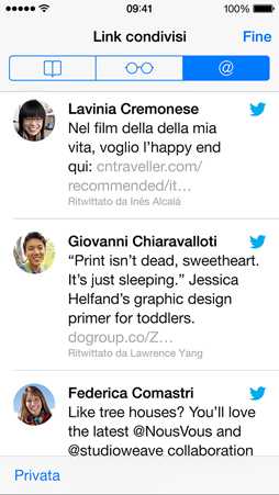 1. Safari per vedere i link di Twitter. Stiamo navigando e vogliamo vedere rapidamente i tweet della nostra timeline? Non servirà più aprire Twitter ma possiamo vederli direttamente dentro Safari cliccando sul tasto Segnalibri e selezionando la scheda “@”. Magicamente compariranno i link dei cinguettii di tutti i nostri followers in ordine cronologico.