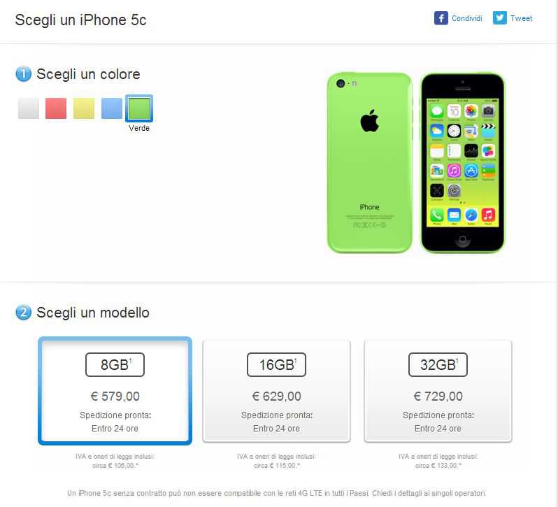 Da questa mattina sull’Apple Store Italiano è finalmente arrivato il nuovo iPhone 5c 8 GB , già disponibile da tempo all’estero e che è acquistabile direttamente online sullo store Apple ad un prezzo di 579€.