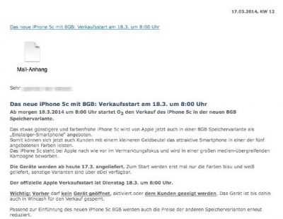 Come ben si sa il Melafonino colorato di casa Apple non ha avuto il successo che Apple sperava, Addirittura alcuni report del settore parlano di 3 milioni di unità invendute. A quanto pare Apple per cercare di rilanciare il colorato iPhone ha deciso di lanciare sul mercato una nuova versione da 8GB . A confermare questo sembrerebbe essere un documento interno della compagnia telefonica O2, che renderebbe noto l’ intenzione di Apple nel vendere una versione di iPhone 5C da 8 GB al prezzo di 509 euro, 60 euro in meno rispetto all’attuale versione da 16 GB attuale venduto dalla compagnia O2.