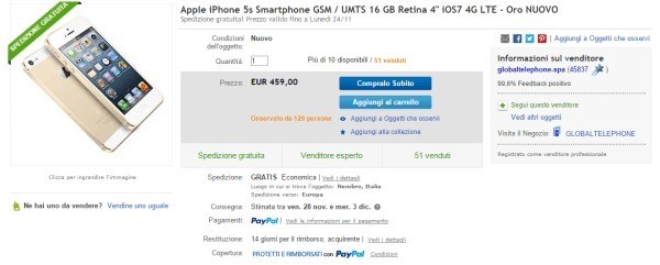 iPhone 5s nella colorazione Gold da 16GB è disponibile su eBay al prezzo di 459€ con spedizione gratuita.