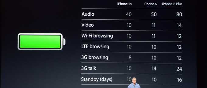 L’iPhone 6 sarà anche più efficiente, quindi aspettatevi aumenti la durata della batteria. Secondo le statistiche presentate da Apple, il tempo di conversazione in 3G tempo è aumentato da 10 a 14 ore e durante la navigazione e la riproduzione video Wi-Fi è salito da 10 a 11 ore.