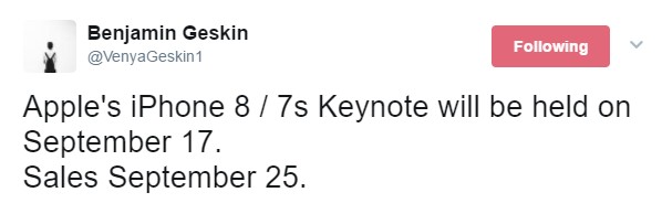 Apple iPhone 8 keynoteSecondo le ultime informazioni trapelate iPhone 8 dovrebbe essere presentato insieme ai nuovi modelli 7S il giorno 17 settembre, la sua data di uscita sarebbe poi fissata per il 25 settembre. Analizzando le date ci siamo accorti che il 17 settembre è domenica ed il 25 lunedì, diciamo che queste date non ci ispirano parecchio, ma sperare non fa mai male.