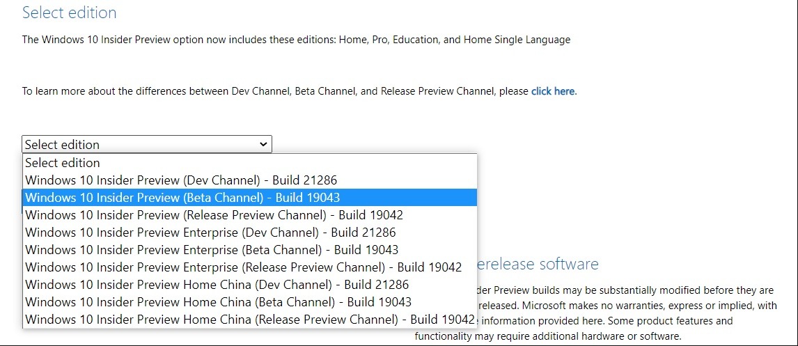 - Selezionare “Windows 10 Insider Preview (Beta Channel)” – Build 19043.