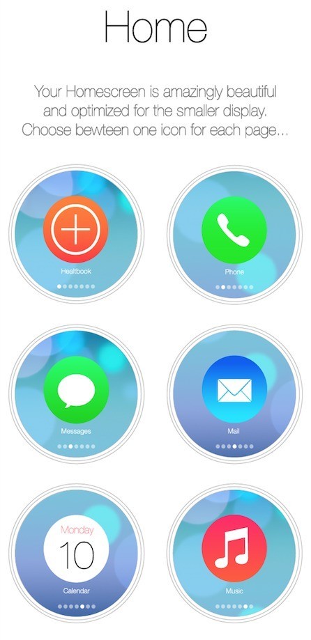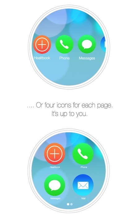 Partendo dalla schermata Home, sencondo gli autori del concept, iWatch avrà un quadrante rotondo e simile a quello di iPod nano di sesta generazione. La disposizione delle icone potrebbe essere in stile iPhone (2×2) oppure una serie di icone in seguenza, orizzontali, con possibilità da parte dell’utente di scegliere la visualizzazione che più gli piace.
