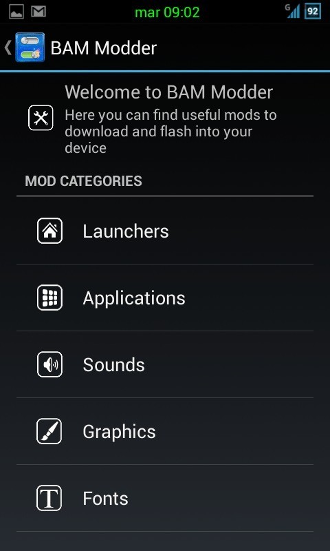 Nell’ultima release della Jellybam (la 7.1.0) troviamo anche una nuova sezione nelle impostazioni di sistema, denominata BAM Modder. Tale sezione permette di scaricare sul proprio dispositivo, una serie di mod aggiuntive divise per categoria: