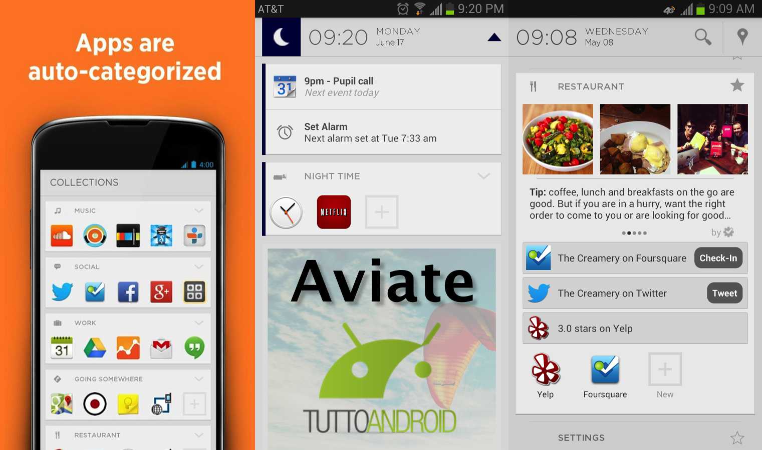 Aviate Launcher è un “progetto” molto interessante. E’ un launcher ancora in fase Alpha, a cui mancano quindi ancora varie funzioni, che si rifà molto allo stile “cards” di Google Now. E’un launcher molto bello esteticamente, con possibilità di widget e applicazioni preferite sulla pagina principale, una serie di “collezioni” (categorie di app ordinate per il loro genere) sulla seconda schermata, mentre nell’ultima schermata avremo il semplice elenco delle applicazioni installate, ordinate alfabeticamente. Inoltre, il launcher sfrutta la geolocalizzazione per capire dove ci troviamo (a casa, a lavoro, in viaggio, al bar) e adattare la schermata principale alle nostre esigenze. Provare per credere! Non è possibile, almeno non ancora, aggiungere schermate o ordinarle a nostro piacimento, così come non c’è nessuna possibilità di installare gli icon pack. In compenso si possono notare la fluidità ottima pur essendo una versione ancora Alpha, e una notevole originalità del launcher, che appare come uno dei più gradevoli di tutto il Play Store.