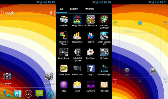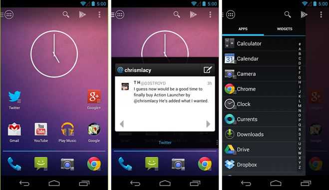 Action Launcher è uno dei launcher più originali, più gradevoli e allo stesso tempo più funzionali che io abbia mai provato: è attualmente il mio launcher predefinito, ha uno stile completamente nuovo, con la lista delle app installate che sbuca da sinistra facendo uno swipe. Le schermate sono utilizzabili come al solito, con collegamenti, widget, cartelle. Il plus è la funzione cover, ossia la trasformazione di una cartella in una “cartella nascosta dentro un’icona” (non so spiegarvelo meglio di così!), in modo da evitare le spesso anti-estetiche cartelle. Supporto agli icon pack e a certe funzioni richiamabili tramite gestures, l’unico difetto è che esiste solo una versione, a pagamento. Con Android KitKat disponibili anche le trasparenze nelle barre di sistema.