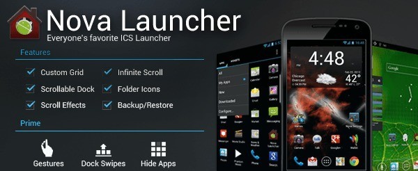 ADW Launcher era il re dei launcher fino all’arrivo di Android 4.0. Con numerosi temi si era imposto fino a Gingerbread, pagando poi lo scotto di rimanere con una grafica “antica” nel fronteggiare i nuovi e agguerritissimi Nova e Apex, perdendo a loro vantaggio il trono. Un po’ di mesi fa si è rifatto il look, adattandosi al nuovo style di Android 4+, anche se in ritardo per riguadagnare lo scettro perduto. Rimane un ottimo launcher, molto personalizzabile anche se non tra i più leggeri. Supporta gli icon pack e ha qualche opzione grafica in più rispetto ai sopracitati Nova e Apex. Disponibile sia la versione free che quella a pagamento (ADW Launcher EX). Compatibile con tutte le versioni di Android.