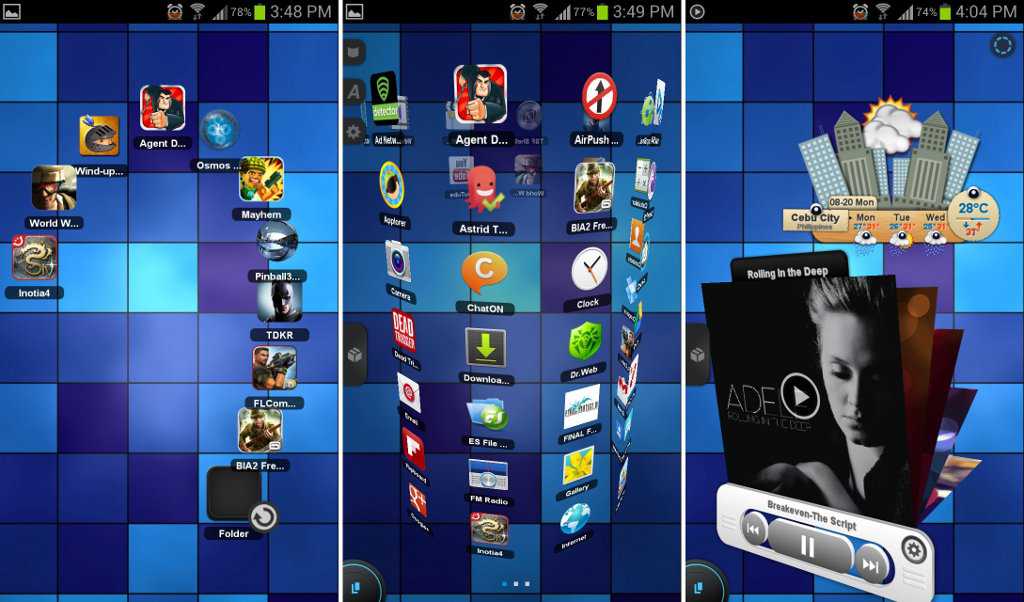 Next Launcher 3D si colloca nella fascia dei launcher che fanno degli effetti grafici il proprio punto forte. Le funzioni e i widget sono innumerevoli, e la personalizzazione è estrema ma, essendo un GO Software, richiede componenti aggiuntivi da installare. Presente in due versioni, una lite e una full, in modo da poter essere provata prima dell’acquisto, presenta ancora qualche difetto di gioventù, essendo stato lanciato abbastanza recentemente. Non è aperto ai classici icon pack, ma solo (come dicevamo prima) ai GO Software, alla lunga può stufare per certe trovate grafiche forse esagerate. Nella sua versione full l’esborso sarà importante, quasi 8€ per questo launcher che per ora non raggiunge comunque il livello degli altri launcher 3D.