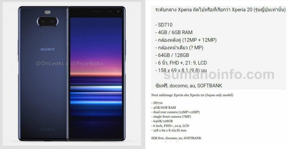 Il nuovo Sony Xperia 20 dovrebbe fare il suo debutto sul mercato entro qualche mese. Oggi torna protagonista sulle nostre pagine grazie al rilascio di nuove informazioni tecniche pubblicate sul portale Sumahoinfo. Oltre alle specifiche tecniche sono emersi anche dei nuovi render che mostrerebbero un comparto estetico davvero molto simile a quello del Sony Xperia 10. Sony è tornata a puntare su uno schermo panoramico, per così dire, il classico 21:9 che molti utenti hanno già avuto modo di apprezzare su altri prodotti della gamma.