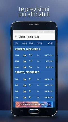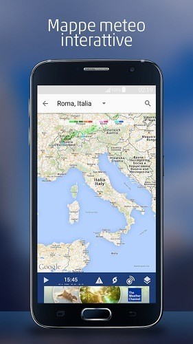 La app di TWC dispone di uno schermo Home dinamico, che cambia in base alla tua attuale posizione, il tempo, e l’ora del giorno. Ha intervalli di aggiornamento orari, 15 al giorno, e le previsioni di fine settimana in unità di misura metriche, imperiali o ibride. L’attuale funzione delle condizioni climatiche genera una una esatta situazione del tempo, dell’umidità, del punto di rugiada, l’orario dell’alba, del tramonto, la velocità del vento, l’indice UV, la visibilità e la pressione barometrica. Ci sono mappe meteorologiche che mostrano vedute stradali e satellitari, la temperatura dell’acqua, la velocità del vento, la copertura nevosa, e altre proprietà. Gli avvisi di maltempo sono forniti tramite le notifiche, così come gli avvisi di pioggia per la vostra posizione GPS e i rapporti pioggia del mattino per le posizioni preferite. Davvero un canale sul meteo a 360 gradi.
