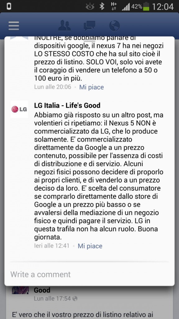 La notizia è relativa la fatto che alcune catene italiane avevano messo in vendita il Nexus 5 a prezzi ben più alti rispetto ai prezzi appena menzionati e gli utenti, giustamente hanno cercato di capirne il motivo. Euronics vende il modello a 459€ mentre Saturn a 399€ (parlando sempre del modello a 16 GB). La discussione è quindi nata veloce nei social network dove alcuni pensavano fosse per via della garanzia, altri invece sostenevano i costi di gestione che una catena deve tenere, fino a quando la discussione non si è protratta sul profilo Facebook di LG Italia, la quale ha chiuso il dibattito in questo modo: