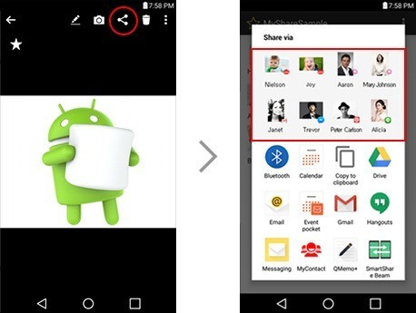 Direct Share è stato aggiunto, permettendo di scegliere un’app con la quale condividere, e quindi una persona. Ora, saranno consigliate le combinazioni di app e persone condivise spesso. Quando si seleziona Condividi via, si riceveranno fino a 8 raccomandazioni di app e contatti con cui condividere.