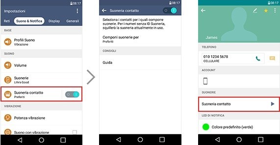 Andare in Impostazioni audio e selezionare i contatti per i quali comporre suonerie. In Contatti, si può visualizzare in anteprima la suoneria ID di ogni contatto. Per i numeri senza suoneria ID, suonerà la suoneria in uso.