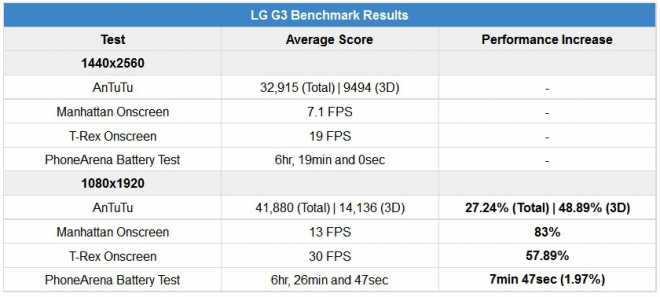 Utilizzando l’applicazione Nomone Resolution Changer su un LG G3 3GB coreano (modello F400S), con permessi di root abilitati (necessari al corretto funzionamento dell’applicazione) e con sistema operativo Android KitKat, sono stati effettuati diversi test che hanno evidenziato come, abbassando la risoluzione, non si verificano particolari miglioramenti per quanto riguarda la durata della batteria (anche qui si sono lamentati problemi di durata, accusando proprio il display), ma le prestazioni sono decisamente migliorate.