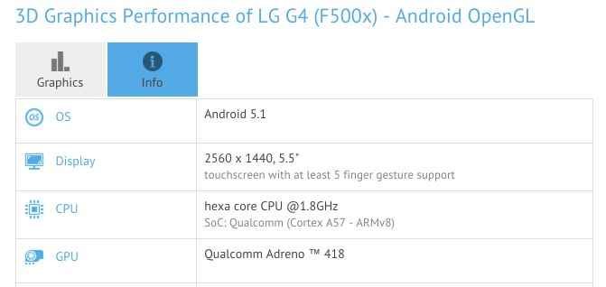 Da un’immagine proveniente dai laboratori di GFXBench, il futuro LG G4 (F500X) evidenzia, oltre al processore Snapdragon 808, anche un display QHD da 5,5 pollici, 3GB di RAM e Android 5.1 a bordo.