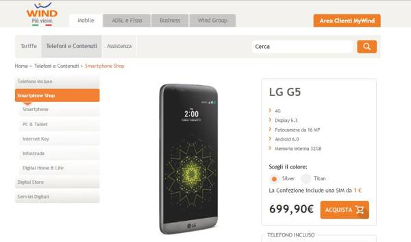 Come anticipato da Wind Italia quindi, LG G5 sarà disponibile nelle colorazioni Silver e Titan ed acquistabile inizialmente al prezzo di 699,90 euro e successivamente anche a rate attraverso un piano ricaricabile od in abbonamento secondo queste modalità: