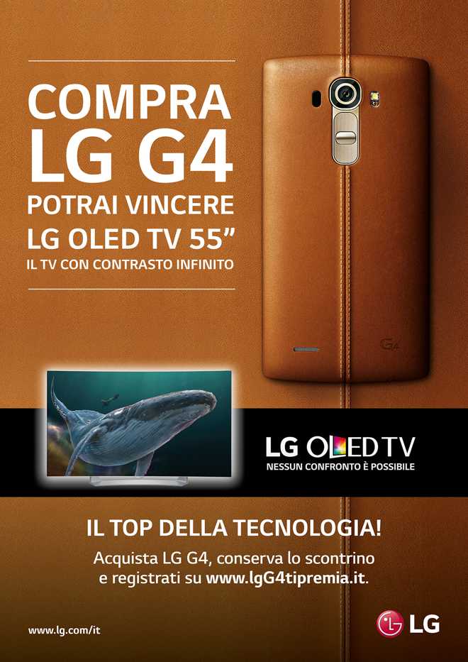 LG presenta la promozione “Vinci LG OLED TV con LG G4” dedicata all’acquisto di LG G4, l’attuale smartphone top di gamma dell’azienda coreana. Grazie a questa, tutti coloro che acquisteranno uno smartphone LG G4 presso una delle insegne associate o sui rispettivi e-commerce nel periodo di validità della promozione, potranno partecipare all’estrazione di un TV OLED LG modello 55EG910V, FULL HD da 55 pollici.