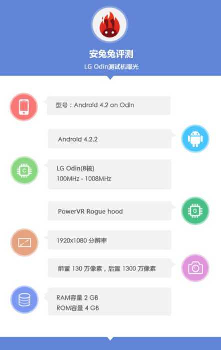 Sempre dai risultati di AnTuTu Benchmark poi abbiamo scoperto che l’LG Odin è affiancato da una GPU PowerVR della serie Rogue, la medesima che è possibile apprezzare nell’iPhone 5S e che dovrebbe garantirebbe buone performance.