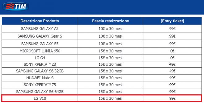 TIM è stata invece la più veloce tra gli operatori telefonici italiani ad aggiornare il proprio piano di abbonamento con smartphone incluso, aggiungendo da alcune ore proprio il nuovo LG V10: secondo quanto riportato nel nuovo listino prezzi, sarà possibile acquistare LG V10 versando un anticipo di 99€ e successivamente corrispondere 15€ al mese per 30 mesi, che includono anche un piano tariffario non ancora specificato dall’azienda.