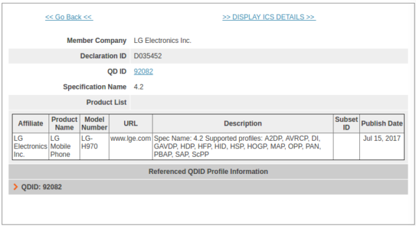 Il prodotto LG certificato riporta il codice modello LG-H970, praticamente è assodato che si tratti di LG V30. Purtroppo però rispetto ad alcuni top gamma 2017 che montano il nuovo Bluetooth 5.0 il V30 arriverà sul mercato con la versione 4.2. La novità più entusiasmante del nuovo Bluetooth 5.0 è la possibilità di pilotare due dispositivi contemporaneamente, quindi prima mancanza che di certo però non comprometterà la bontà del prodotto.