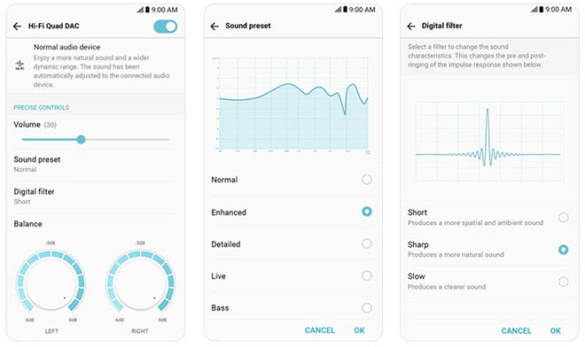 Frasi che tutto sommato equivalgono quelle proferite, tempo addietro, in occasione del lancio del predecessore LG V20. La società coreana promette ad ogni modo ulteriore migliorie rispetto al bel lavoro orchestrato lo scorso anno, confezionando dunque uno smartphone che farà dell’audio – ma non solo, in ragione della fotocamera con apertura focale monstre da f/1.6 – il proprio punto di forza. LG V30 includerà pertanto un aggiornato e nuovo di zecca DAC Hi-Fi (convertitore digitale-analogico), corroborato tra le altre cose da una minuziosa attenzione al comparto software. In ossequio ad una patnership con la tecnologia ESS di California, l’avanzato Quad DAC Hi-Fi di LG V30 introdurrà funzionalità particolari come filtri digitali e preset audio, nel tentativo di metter a disposizione degli utenti una esperienza ancor più personalizzabile ed un suono di alta qualità, anche con delle <<normali>> cuffie. Le screenshots in calce all’articolo spiegano chiaramente quale sarà il livello di personalizzazione audio raggiunto dal nuovo smartphone LG.
