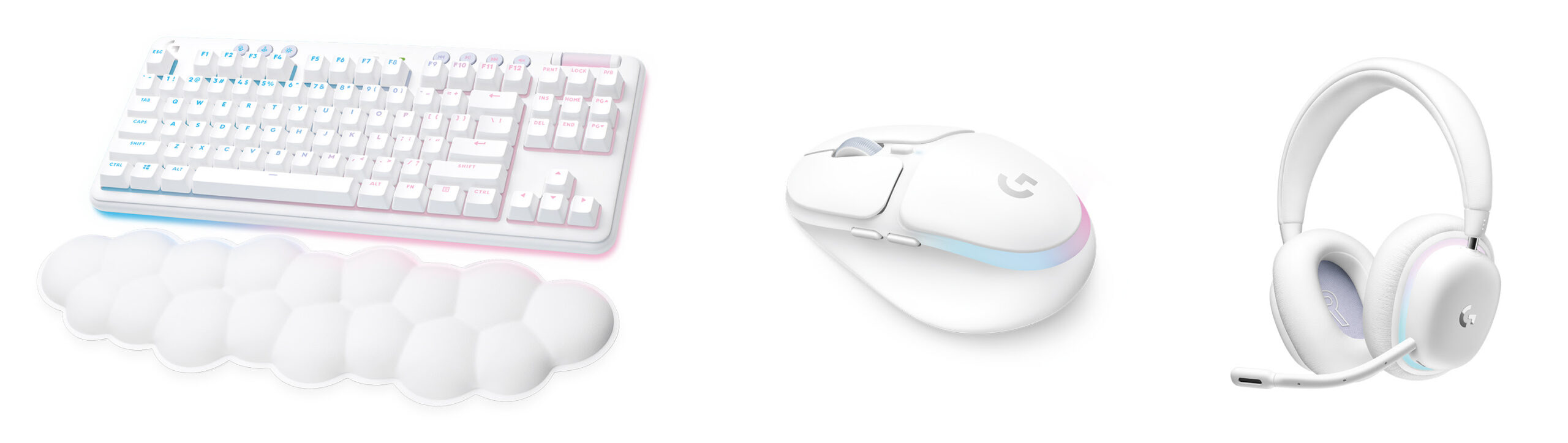 - Accessori – La collezione comprende anche otto nuovi accessori che includono tocchi stravaganti come il poggiapolsi a forma di nuvola, il ferma-cavo e la custodia per il trasporto a forma di cuore. Altri accessori includono cuscinetti per le orecchie e boom mic, top plate per le tastiere G713 e G715, estrattore e spazzola per keycap e mousepad.
