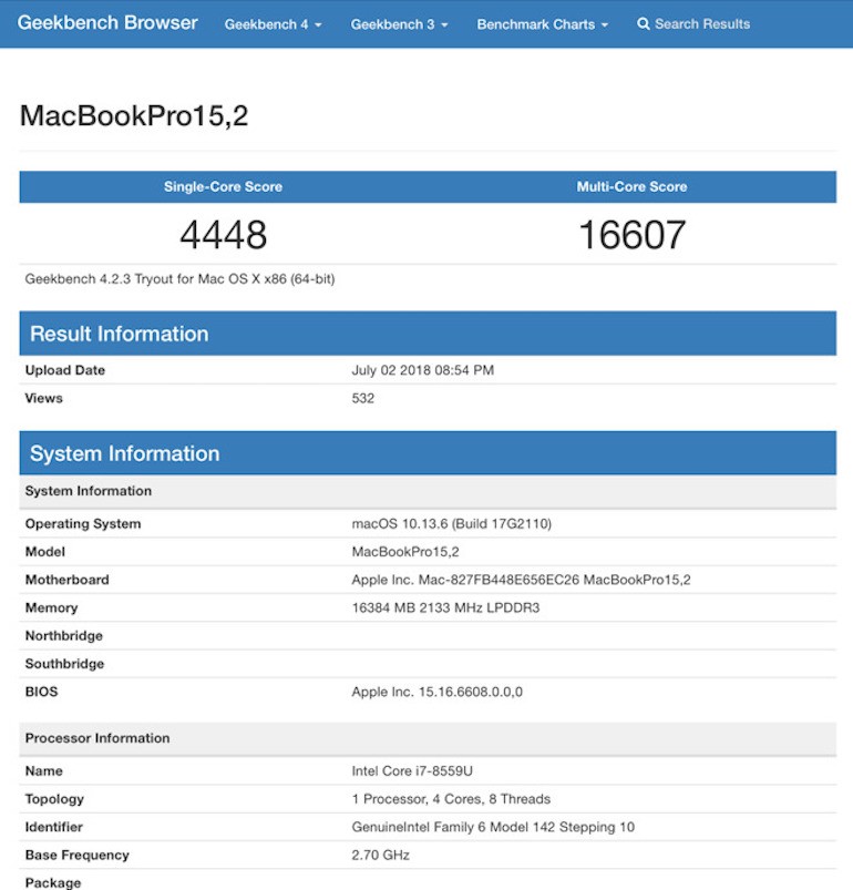 Il modello mostrato da Geekbench potrebbe riferirsi ad una versione aggiornata del MacBook Pro da 13 pollici, che mostra punteggi superiori rispetto all’attuale modello del 2017. Dal confronto diretto tra i due computer si evidenzia un incremento piuttosto evidente nel multi-core e un minore aumento nel single-core. La versione del 2017 ha raggiunto 4600 e 9500 punti, mentre il presunto modello del 2018 4448 e 16607. Per quanto riguarda il sistema operativo, il Mac testato da Geekbench era stato aggiornato con macOS 10.13.6 con numero di build 17G2110, una versione di macOS High Sierra attualmente in versione di beta test.