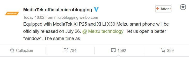 MediaTek ha pubblicato un nuovo post sui suoi canali social dove ha confermato che 2 nuovi dispositivi dotati di processori di casa saranno lanciati sul mercato. Visto che il prossimo 26 luglio gli unici prodotti ad arrivare sul mercato saranno i nuovi Meizu Pro 7 non può che trattarsi dei prodotti della casa cinese.