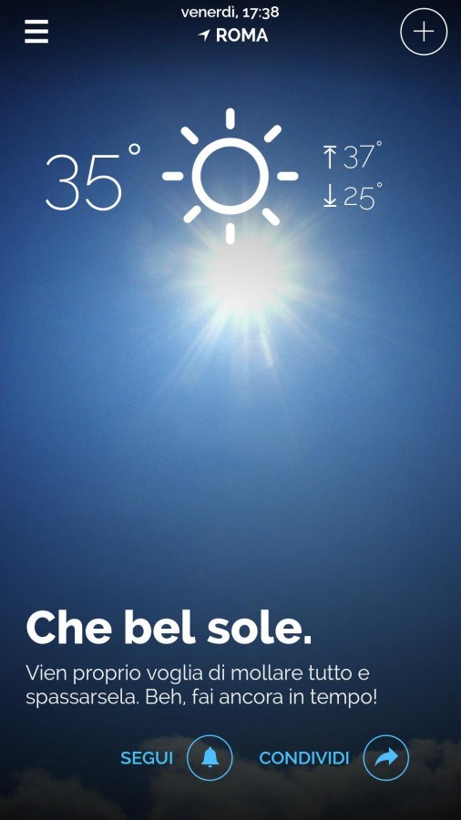 Oltre alla nuova veste grafica e alle animazioni di sfondi con immagini sempre nuove, legate alle condizioni meteo correnti, Meteo.it si presenta con una serie di frasi divertenti, sagge e inerenti al tempo, rendendo l’app ancora più piacevole. Le funzioni sono rimaste quasi le stesse, a parte i collegamenti diretti con altre applicazioni targate Mediaset (Sport Mediaset,Tgcom24, TG5), e la nuova funzione di alert, molto comoda, che permette di mettere sotto controllo il tempo di una località a scelta, in una determinata data, e con avviso in caso di variazioni. Presente anche la possibilità di condividere sui social network le previsioni di una determinata località. Purtroppo non è presente il widget per le nostre schermate, ma lo staff ci ha assicurato che è in piano di produzione per la prossima versione.
